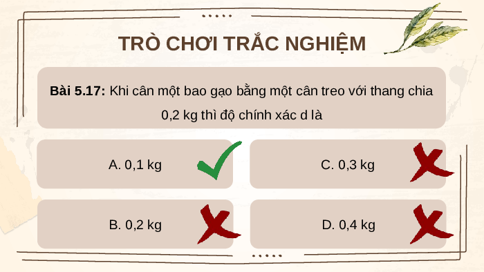 0,2 kg thì độ chính xác d là A. 0,1 kg C. 0,3 kg B. 0,2 kg D. 0,4 kg