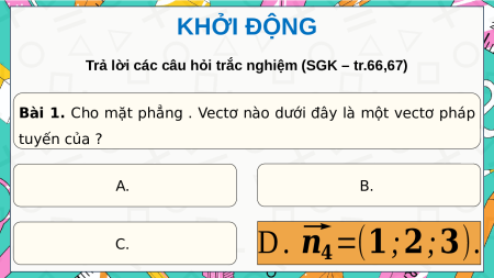 Bài 1. Cho mặt phẳng . Vectơ nào dưới đây là một vectơ pháp tuyến của ? A. B. C. D . ⃗ 𝑛 𝒏 𝟏 𝟐 𝟑 4