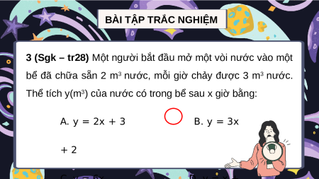 Thể tích y(m3) của nước có trong bể sau x giờ bằng: A. y = 2x + 3 B. y = 3x + 2 C. y = 6x D. y = x + 6