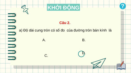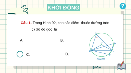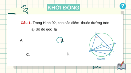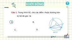 Câu 1. Trong Hình 92, cho các điểm thuộc đường tròn b) Số đó góc là A. B. C. D. KHỞI ĐỘNG