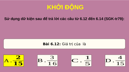 Bài 6.12: Giá trị của là 2 𝟐 3 1 4 A . . B . C . D . 15 𝟏𝟓 1 6 5 15