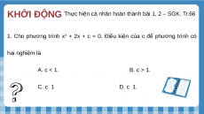 1. Cho phương trình x2 + 2x + c = 0. Điều kiện của c để phương trình có hai nghiệm là A. c < 1. B. c > 1. C. c 1 D. c 1.