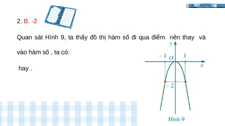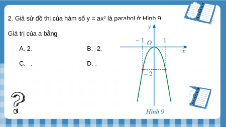 2. Giả sử đồ thị của hàm số y = ax2 là parabol ở Hình 9. Giá trị của a bằng A. 2. B. -2. C. . D. . Bài giải 1 1. A. c < 1.