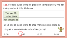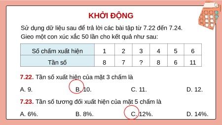 7.23. Tần số tương đối xuất hiện của mặt 5 chấm là A. 6%. B. 8%. C. 12%. D. 14%. KHỞI ĐỘNG