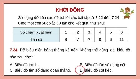 7.24. Để biểu diễn bảng thống kê trên, không thể dùng loại biểu đồ nào sau đây? A. Biểu đồ tranh.