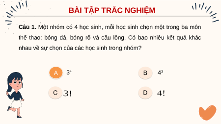 Câu 1. Một nhóm có 4 học sinh, mỗi học sinh chọn một trong ba môn