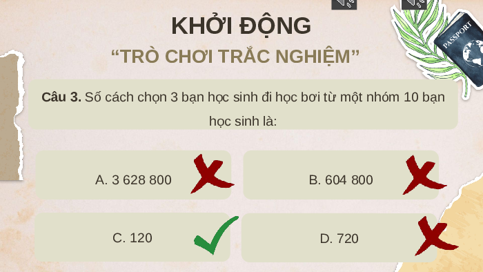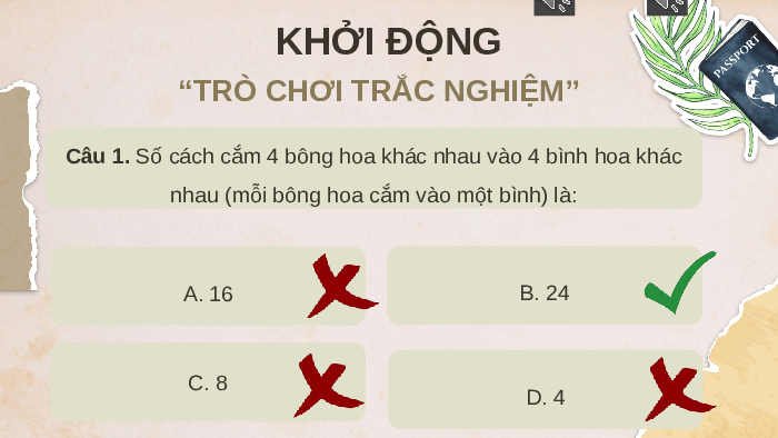 nhau (mỗi bông hoa cắm vào một bình) là: A. 16 B. 24 C. 8 D. 4 KHỞI ĐỘNG