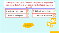 ngẫu nhiên 2 cây bút từ hộp bút và thấy hai bút có cùng màu xanh là. A. Biến cố chắc chắn. B. Biến cố ngẫu nhiên. C. Biến cố không thể.