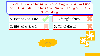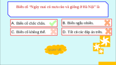 Biến cố “Ngày mai có mưa rào và giông ở Hà Nội” là A. Biến cố chắc chắn. B. Biến ngẫu nhiên. C. Biến cố không thể.