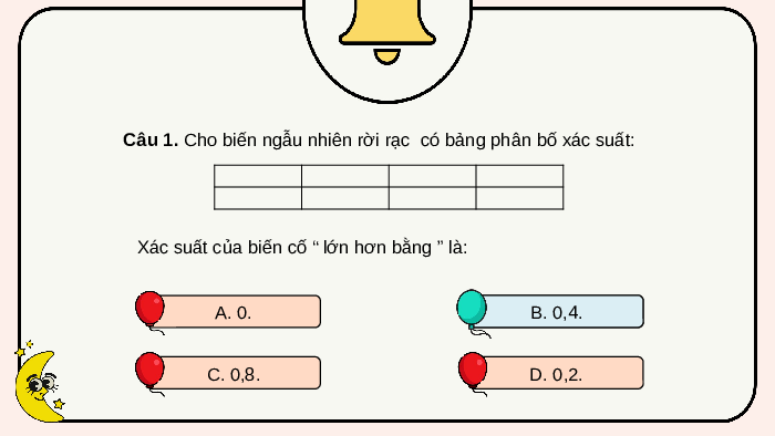 Xác suất của biến cố “ lớn hơn bằng ” là: A. 0. B. .0 ,4. , C. 0,8. D. 0,2.