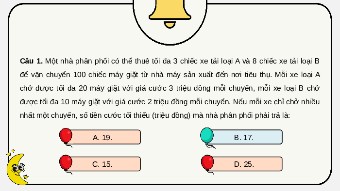 nhất một chuyến, số tiền cước tối thiểu (triệu đồng) mà nhà phân phối phải trả là: A. 19. B. 1 . 7. 1 C. 15. D. 25.