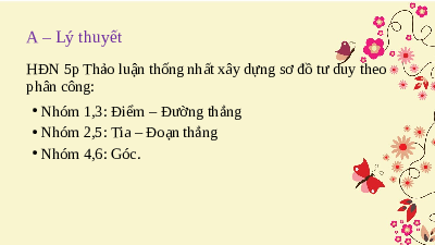 • Nhóm 2,5: Tia – Đoạn thẳng • Nhóm 4,6: Góc. M d (M thuộc d) a song song với b ( a b) // ∙ a M d b ĐIỂM, A, B, C thẳng hàng ĐƯỜNG THẲNG a cắt b tại giao điểm P B nằm giữa A và C a P b ∙ ∙ A ∙ B ∙ C