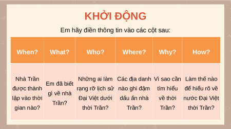 Em hãy điền thông tin vào các cột sau: When? What? Who? Where? Why? How? Nhà Trần