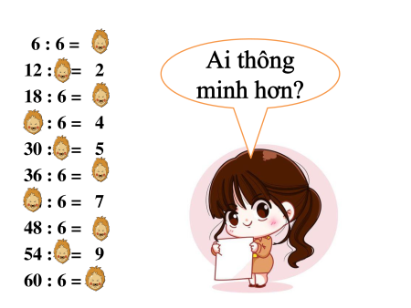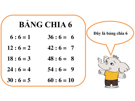 Tên bài: Bảng chia 6 (tiết 1) BẢNG CHIA 6 Đây là bảng chia 6 6 : 6 = 1 36 : 6 = 6 12 : 6 = 2 42 : 6 = 7 18 : 6 = 3 48 : 6 = 8 24 : 6 = 4 54 : 6 = 9 30 : 6 = 5 60 : 6 = 10