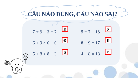 CÂU NÀO ĐÚNG, CÂU NÀO SAI? Đ 7 + 3 = 3 + 7 5 + 7 = 13 S 6 + 9 > 6 + 6 Đ 8 + 9 = 17 Đ 5 + 8 < 8 + 3 S 4 + 8 = 13 S Bài 12