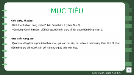- Hình thành được bảng nhân 2, biết đếm thêm 2 (cách đều 2).
