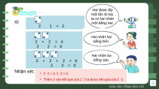 Giáo viên: Phạm Kim Chi Hai được lấy một lần là hai, ta có hai nhân a) một bằng hai. 2 1 = 2 Hai nhân hai 2 + 2 = 4 bằng bốn. 2 2 = 4 Hai nhân ba 2 + 2 + 2 = 6 bằng sáu. 2 3 = 6 Nhận xét: • 2 2 = 4; 2 3 = 6.
