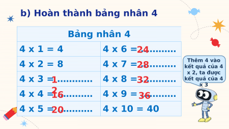 b) Hoàn thành bảng nhân 4