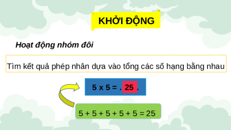 Tìm kết quả phép nhân dựa vào tổng các số hạng bằng nhau 5 x 5 = …?.. 25 . 5 + 5 + 5 + 5 + 5 = 25 NỘI DUNG BÀI HỌC 01