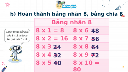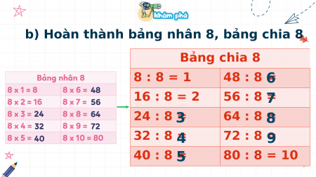 b) Hoàn thành bảng nhân 8, bảng chia 8