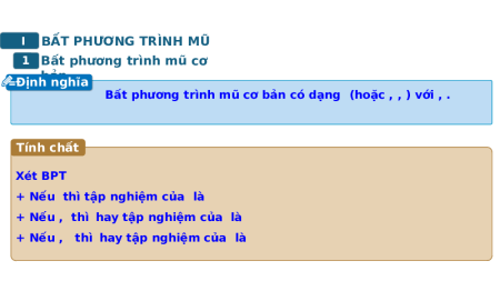 Định nghĩa Bất phương trình mũ cơ bản có dạng (hoặc , , ) với , . Tính chất Xét BPT