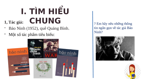 BÍ ẨN CỦA LÀN NƯỚC (Bảo Ninh) I. TÌM HIỂU 1, Tác giả: CHUNG ? Em hãy nêu những thông