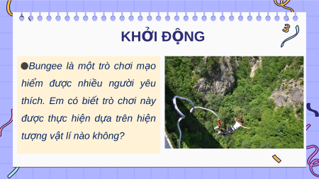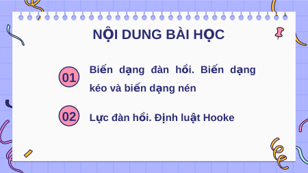 10TH GRADE CHÀO M NG Ừ CÁC EM Đ N Ế VỚI BÀI H C HÔM NA Ọ Y! KH I Đ Ở NG Ộ ●Bungee là m t ộ trò ch i ơ m o ạ hiểm đư c ợ nhi u ề ngư i ờ yêu thích. Em có bi t ế trò ch i ơ này được th c ự hi n ệ d a ự trên hi n ệ tư n ợ g v t ậ lí nào không? CHƯƠNG VII. BI N Ế D NG C Ạ A Ủ V T Ậ R N. Ắ ÁP SU T Ấ CH T L Ấ N Ỏ G BÀI 33. BI N D Ế N Ạ G C A Ủ V T R Ậ N Ắ N I DU Ộ NG BÀI H C Ọ Bi n ế d n ạ g đàn h i ồ . Bi n ế d n ạ g 01 kéo và bi n ế d n ạ g nén 02 Lực đàn h i ồ . Đ n ị h lu t ậ Hooke