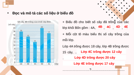 Dưới đây là biểu đồ cho biết số cây đã trồng của khối lớp Bốn. Biểu đồ biểu thị gì? Hàng ngang bên dưới cho biết gì? Nhận xét sự liên quan của độ cao các cột tô màu với số ghi ở cột bên trái