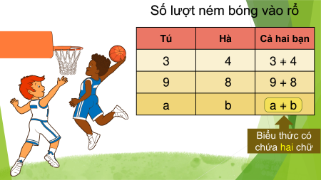 Số lượt ném bóng vào rổ Tú Hà Cả hai bạn 3 4 3 + 4 9 8 9 + 8 a b a + b Biểu thức có chứa hai chữ