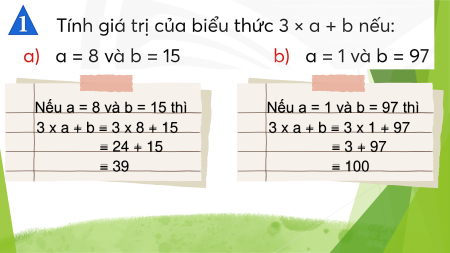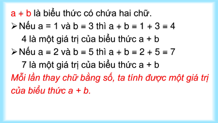Mỗi lần thay chữ bằng số, ta tính được một giá trị của biểu thức a + b.