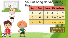 Số lượt bóng đá vào khung thành An Bảo Nam Cả ba bạn 3 2 4 3 + 2 + 4 5 6 7 5 + 6 + 7 a b c a + b + c Biểu thức có chứa ba chữ