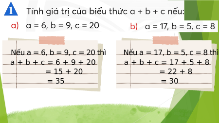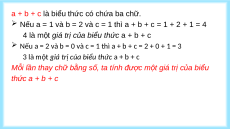Mỗi lần thay chữ bằng số, ta tính được một giá trị của biểu thức a + b + c