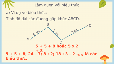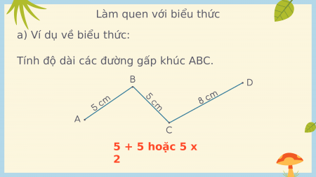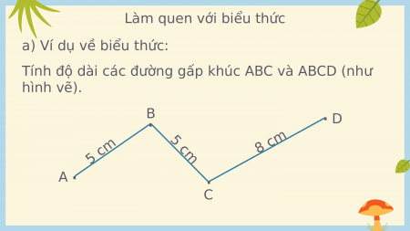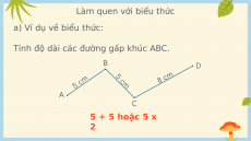 Tính độ dài các đường gấp khúc ABC và ABCD (như hình vẽ). B . D . 5 cm 8 cm 5 cm A . .C Làm quen với biểu thức