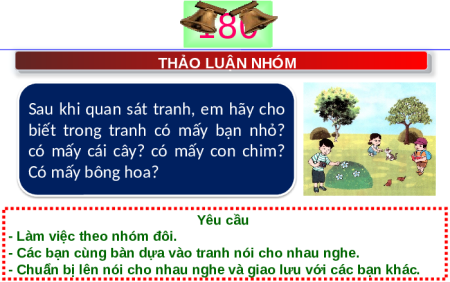 có mấy cái cây? có mấy con chim? Có mấy bông hoa? Yêu cầu