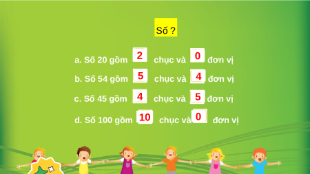 CÁC EM ĐẾN TIẾT HỌC HÔM NAY KHỞI ĐỘNG Số ? a. Số 20 gồm 2 chục và 0 đơn vị b. Số 54 gồm 5 chục và 4 đơn vị c. Số 45 gồm 4 chục và 5 đơn vị d. Số 100 gồm 1 0 chục và 0 đơn vị