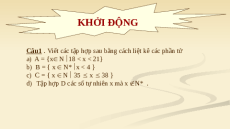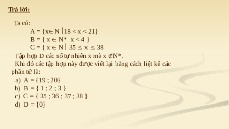 Khi đó các tập hợp này được viết lại bằng cách liệt kê các phần tử là: a) A = {19 ; 20} b) B = { 1 ; 2 ; 3 } c) C = { 35 ; 36 ; 37 ; 38 } d) D = {0} Câu 2: