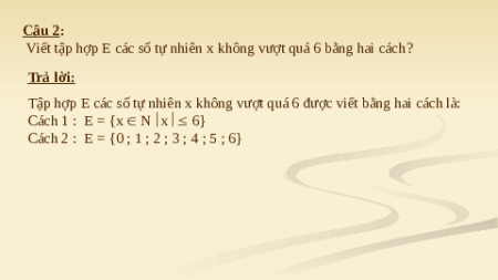 Viết tập hợp E các số tự nhiên x không vượt quá 6 bằng hai cách? Trả lời: