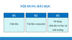 Chất dẻo là gì? Chúng có thành phần và các tính chất cơ lí gì? BÀI 10: CHẤT DẺO VÀ VẬT LIỆU COMPOSITE NỘI DUNG BÀI HỌC 01 02 03 Sử dụng Chất dẻo Vật liệu composite chất dẻo và bảo vệ môi trường