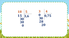 Thực hiện các phép tính 18 : 5; 3 : 4; 18 5 3 4 15 3,6 0 0,75 30 30 30 28 0 20