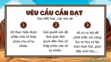 Sau tiết học, các em sẽ: 1 2 3 HS thực hiện được Giải quyết vấn đề HS có cơ hội để phép chia số thập đơn giản liên phát triển các năng phân cho số tự quan đến chia số lực tư duy và lập nhiên. thập phân cho số luận toán học, giao tự nhiên. tiếp toán học,....