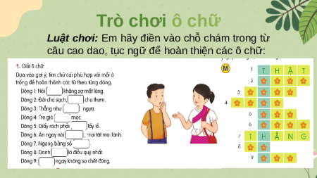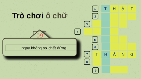 câu cao dao, tục ngữ để hoàn thiện các ô chữ: 1 T H Ậ T 2 Trò chơi ô chữ R Á C H 3 R U Ộ T 4 M Ă N G 01 02 03 04 05 06 07 08 09 5 G I Ữ 6 Ăn. Ăn...G ng n. T Dn h iấ ay ag ẳn T y n a r h y g e á nó..k c i . n g... h i h. h à ... ô ..ư p. đn ., , . iề g . hả. s. i u . mọ .i q ợ . n m.t. c gự ọc ậ uýlt .ấ hết a. y m nh lề ấ đ t . ọi ứlà n n g h. T H Ậ T N Đ ó ó i i .c.. h.. o kshô ạcng h, .s ..ợ .. mấ ch t o lò th ng ơ ọi l . m. ành. . 7 T H Ẳ N G 8 D Ự 9 C Â Y