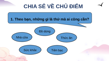 1. Theo bạn, những gì là thứ mà ai cũng cần? Đồ dùng Nhà cửa Thức ăn Sức khỏe Tiền bạc