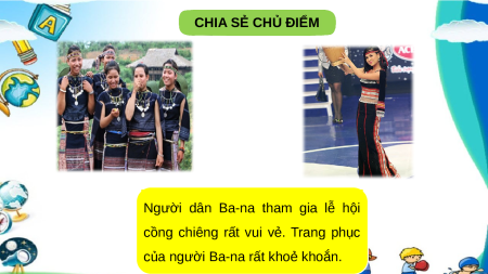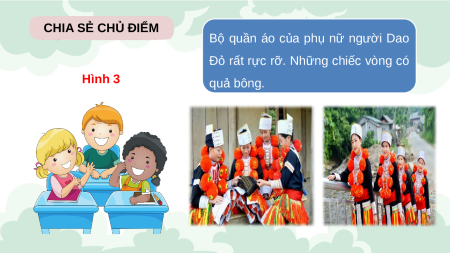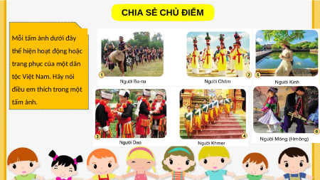 thể hiện hoạt động hoặc trang phục của một dân tộc Việt Nam. Hãy nói điều em thích trong một tấm ảnh. CHIA SẺ CHỦ ĐIỂM