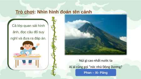 Trò chơi: Nhìn hình đoán tên cảnh Cả lớp quan sát hình ảnh, đọc câu đố suy nghĩ và đưa ra đáp án. Núi gì cao nhất nước ta