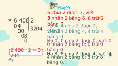 Hạ 0, 0 chia 2 được 0, viết 0. 0 nhân 2 bằng 0; 0 trừ 0 6 408 : 2 = 3 bằng 0.