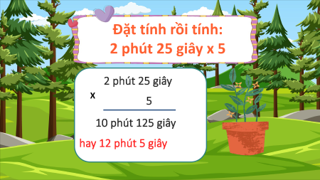 Đặt tính rồi tính: 2 phút 25 giây x 5 2 phút 25 giây X 5 10 phút 125 giây hay 12 phút 5 giây