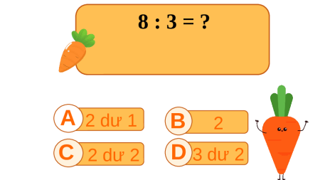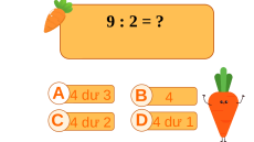 Toán Tớ cần hai củ cà rố X t đ in ể c ch hà uẩ o n c b á ị c KHỞI ĐỘNG bữa tối. Các bạn bạn! giúp tớ nhé! 9 : 2 = ? A 4 dư 3 B 4 C 4 dư 2 D 4 dư 1 Hoan hô