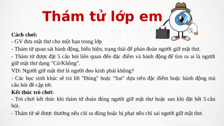 - Trò chơi kết thúc khi thám tử đoán đúng người giữ mật thư hoặc sau khi đặt hết 5 câu hỏi.