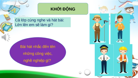 Cả lớp cùng nghe và hát bài: Lớn lên em sẽ làm gì? Bài hát nhắc đến tên những công việc, nghề nghiệp gì? BÀI 2: NGHỀ NGHIỆP