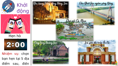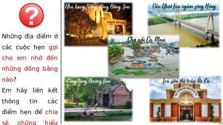 KhởI động Hẹn hò học tập Nhiệm vụ: chọn bạn hẹn tại 5 địa điểm sau, điền vào phiếu hẹn Những địa điểm ở các cuộc hẹn gợi cho em nhớ đến những đồng bằng nào? Em hãy liên kết thông tin các điểm hẹn để chia sẻ những hiểu biết của mình về nền văn minh của những đồng bằng đó? CHỦ ĐỀ 1: VĂN MINH CHÂU THỔ SÔNG HỒNG VÀ SÔNG CỬU LONG NỘI DUNG BÀI MỤC TIÊU HỌC